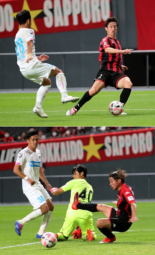 上:上段写真/後半45分、途中出場した札幌DF石川(右)がクロスを入れる、左鳥栖DF宮(38番)