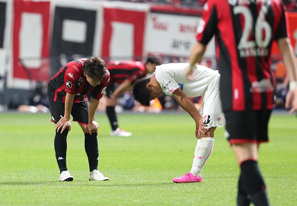 上写真/1−1と引き分けに終わり共にひざに手をやる札幌MF高嶺(左)と鳥栖DF松岡、後方DFキム・ミンテも、右端札幌MF早坂(26番
