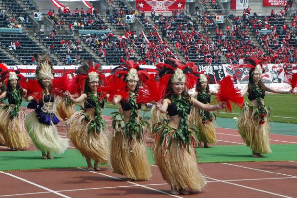 ロアッソ熊本はこの日の試合までホームでの勝利がなく、この日、タヒチアンダンスのフラスクールの女性たち、大人から子供まで約50人が駆けつけ、フラダンスを披露してロアッソ熊本を応援した。腰をくねらせて踊るダンスに、コンサドーレ札幌の選手たちは目がくらんでしまったのか?0−4と大敗し、熊本にホーム初の勝利を献上してしまった。