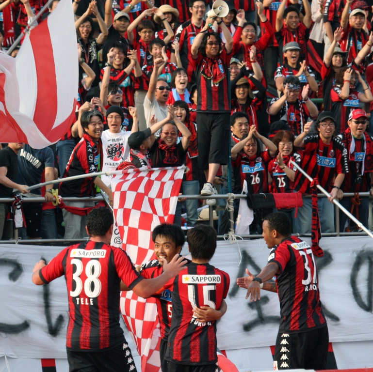 名古屋戦、後半10分先制ゴールを決め、ゴール裏サポーター席近くまで走り寄った札幌MF山本が、笑顔のサポーターたちの前でFWテレ(38番)、MFハモン(37番)、古田(15番)に祝福される。7月28日、札幌厚別公園競技場、撮影・石井一弘