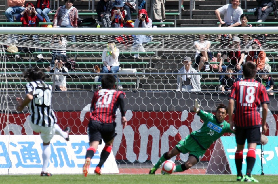 水戸戦、前半27分水戸ホーリーホックFW鈴木隆(30番)が自ら得たPKを決めて先制する。コンサドーレ札幌GK杉山(30番)。5月26日、札幌厚別公園競技場、撮影・石井一弘