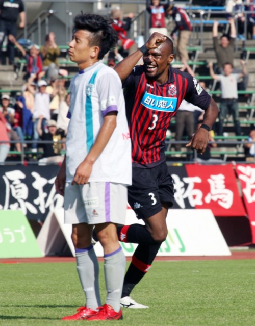 福岡戦、後半追加タイム3分、札幌のDFパウロン(右)が起死回生となる同点ゴールを決めて喜ぶ。アビスパ福岡MF中原が「こんなことあるの?」といった表情。5月31日、札幌厚別公園競技場、撮影・石井一弘