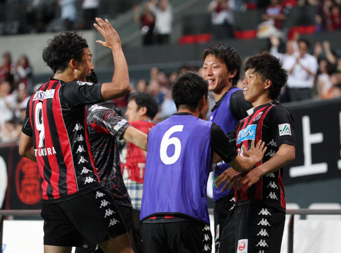 C大阪戦、後半5分プロ初先発のコンサドーレ札幌MF前寛之(右端)が同点ゴールを決め、チームメイトに手荒く祝福される。DF永坂(前の隣り)やFW都倉(左)の大きなジェスチャーが喜びを示しているが、本人はびっくりしたような表情。6月1日、札幌ドーム、撮影・石井一弘