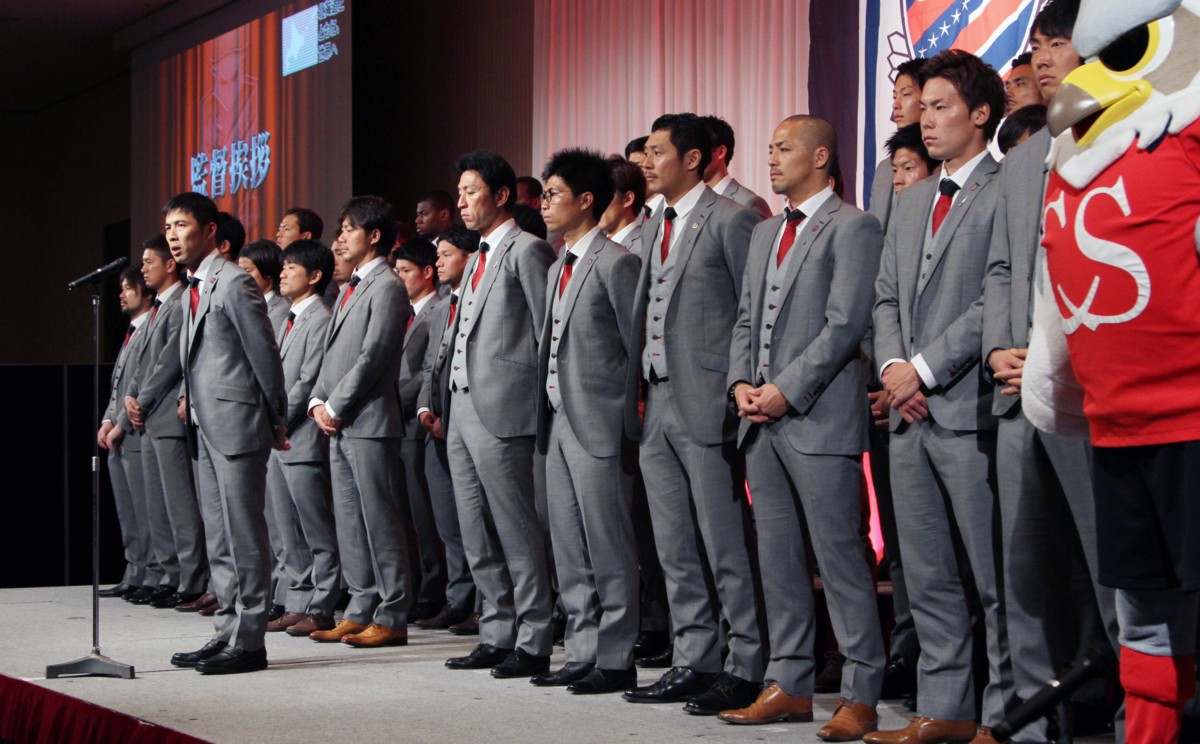 2015コンサドーレ札幌 感謝の集いで、選手、スタッフを代表してあいさつする四方田修平監督。11月24日、札幌市内ホテル、撮影・石井一弘