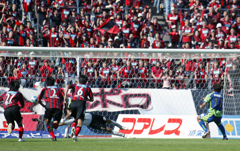 湘南ベルマーレ戦前半ロスタイム、湘南FW阿部(11番)のPKを札幌のGK高原が阻止。9月27日、札幌厚別公園競技場、撮影・石井一弘