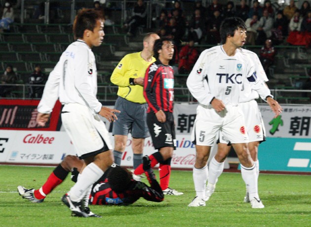 栃木戦前半17分、札幌のFWキリノ(下、倒れている)のオーバーヘッドシュートが決まり、唖然とした表情を見せる左栃木のDF入江と落合(5番)。10月21日、札幌厚別公園競技場、撮影・石井一弘