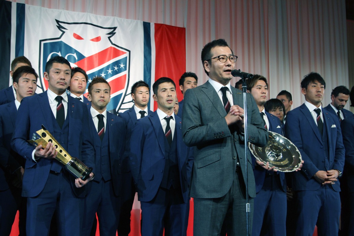 コンサドーレ「感謝の集い」で、あいさつをする野々村芳和社長。11月21日、札幌市内のホテル、撮影・石井一弘