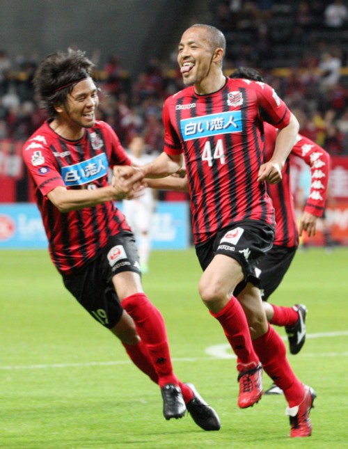 大宮戦の前半16分、先制ゴールを決めた札幌MF小野(44番)が石井(19番)と握手しながらベンチ方向へ走り出す、後方はFW内村。4月26日、札幌ドーム、撮影・石井一弘