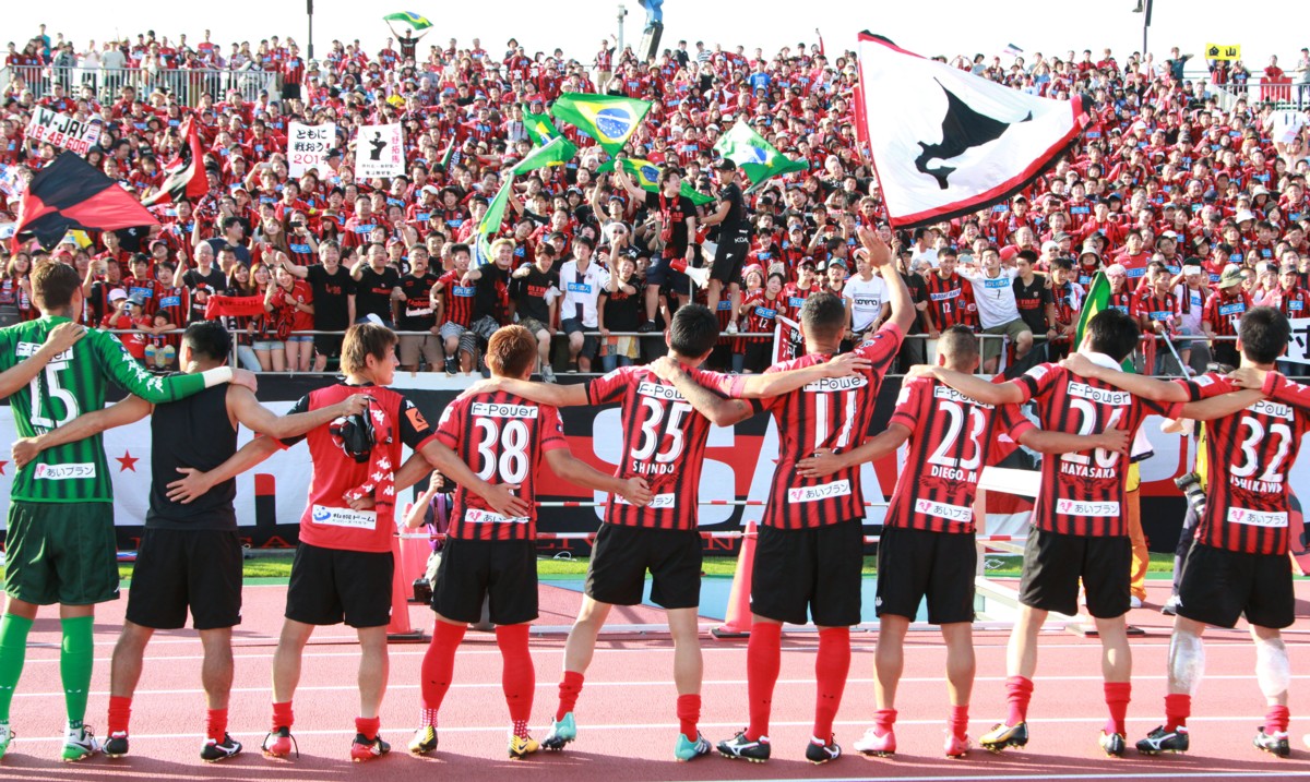 仙台戦、5試合ぶりに勝利した札幌の選手たちを祝福するゴール裏のサポーターたち。決勝点を上げたFWヘイス(11番)が手を上げて応える