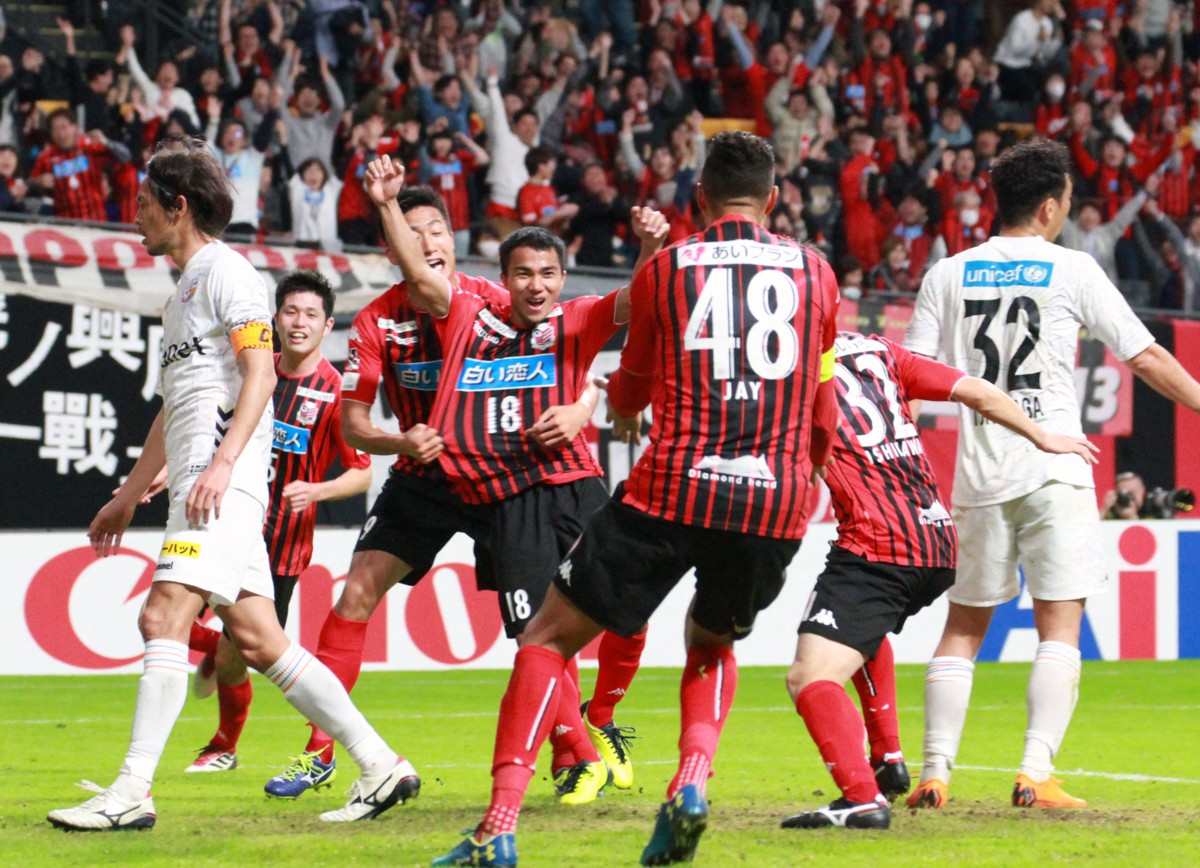 長崎戦の後半追加タイム4分、決勝ゴールを決め両手を上げて喜びを爆発させる札幌MFチャナティップ(18番)、左へFW都倉、DF進藤、48番はアシストしたFWジェイ、32番はDF石川。左端長崎DF高杉、右端DF徳永(32番)。3月18日、札幌ドーム、撮影・石井一弘