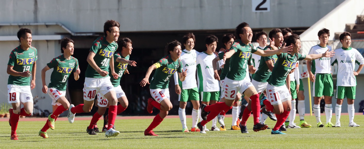 天皇杯、北海道教育大岩見沢校対韮崎アストロスの1回戦。PK戦で韮崎の5人目のキッカーがゴールを外して勝利が決まった瞬間、GK鎌田に向かって喜びを爆発させて走る岩教大の選手たち、右からMF中本(11番)、FW下田、途中出場のMF野村(2番)、見原(6番)、MF鈴木(35番)、途中出場のDF泉山(40番)、MF小笠原(8番)、DF佐藤(19番)。5月27日、札幌厚別公園競技場、撮影・石井一弘