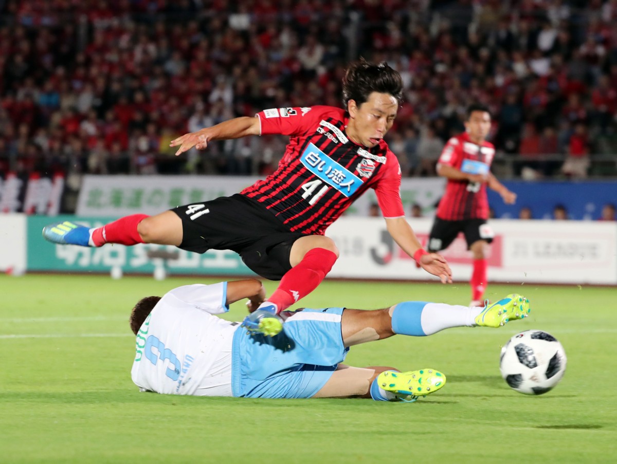 磐田戦の前半29分、札幌MF三好(41番)は右サイドを駆け上がりゴール前に迫るが、磐田DF大井(3番)に一瞬早くクリアされる。7月22日、札幌厚別公園競技場、撮影・石井一弘