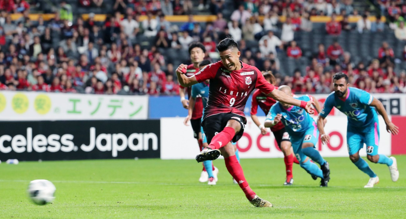 鳥栖戦の後半追加タイム5分、札幌FW都倉(9番)が、自らが鳥栖DF高橋祐に倒されて得たPKを決め勝越し点を上げる。9月29日、札幌ドーム、撮影・石井一弘