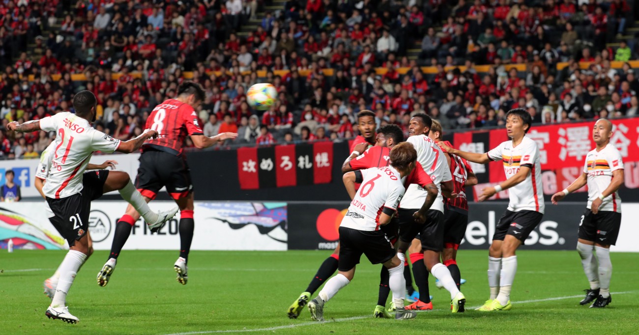 J1第30節、名古屋戦の前半35分、札幌DF福森の左CKからMF深井(8番)が先制のヘディングシュートを決める。1週間前のル杯決勝戦のゴールから2週連続となった。11月2日、札幌ドーム、撮影・石井一弘