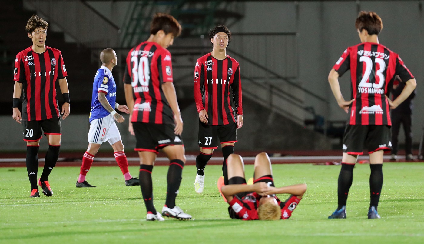 上写真/5人目のPKを外しピッチに倒れ顔を抑える札幌DF福森に視線を送る札幌の選手たち、左からDFキム・ミンテ(20番)、MF金子(30番)、荒野(27番)、中野(23番)。9月2日、札幌厚別公園競技場、撮影・石井一弘