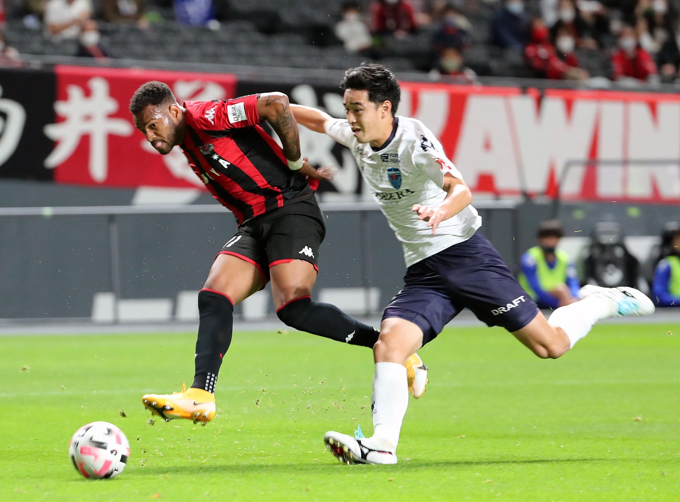 上写真/前半16分、札幌MFアンデルソン・ロペス(左)がFWジェイのワンタッチパスを受け、寄せてきた横浜DF小林をかわしながら先制ゴールを決める。10月24日、札幌ドーム、撮影・石井一弘