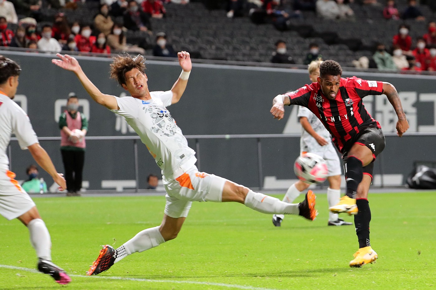 上写真/前半36分、札幌MFアンデルソン・ロペス(右)がFWジェイのパスを胸トラップから逆転ゴールを決める。シュート時に舌を出している(舌を噛まない)ということはミートの瞬間に余計な力が抜けているということか。中央清水DF立田。11月21日、札幌ドーム、撮影・石井一弘