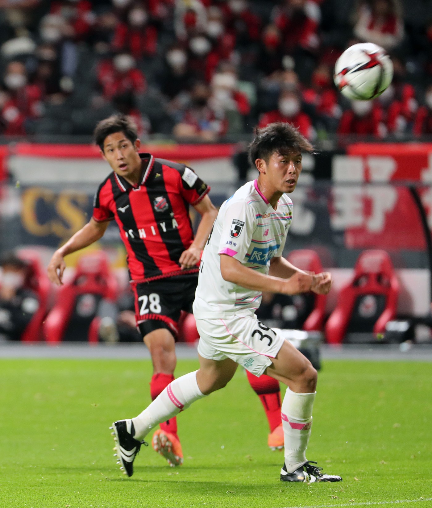 上写真/後半14分、札幌MF青木(28番)が小柏が出したスルーパスを受け、左サイドをドリブルで駆け上がり、右足で初ゴールとなる決勝ゴールを決める、右鳥栖DF松本(39番)。5月5日、札幌ドーム、撮影・石井一弘