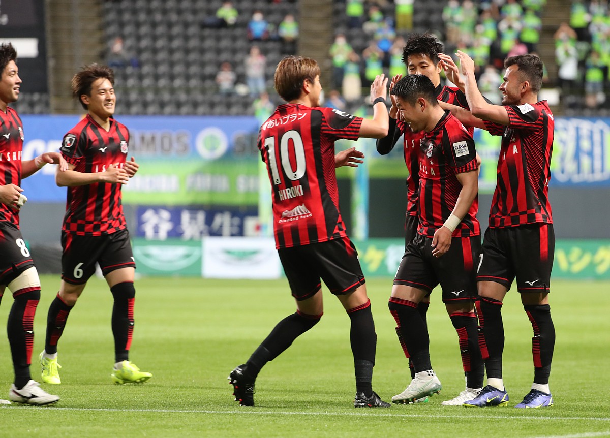 上写真/後半7分、先制ゴールを決めた札幌MF菅(右から2人目)を祝福するルーカス・フェルナンデス(右端)、DF田中(菅の後方)、宮澤(10番)、MF高嶺(6番)、深井(8番)も走り寄る。4月29日、札幌ドーム、撮影・石井一弘