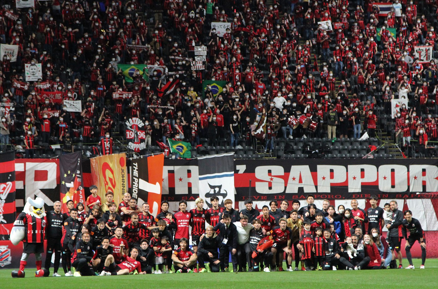 上写真/2022シーズンJ1最終節清水戦後のセレモニーで選手、スタッフ全員とスタンドのサポーターが一緒に記念写真に収まった(11月5日、札幌ドーム、撮影・石井一弘)