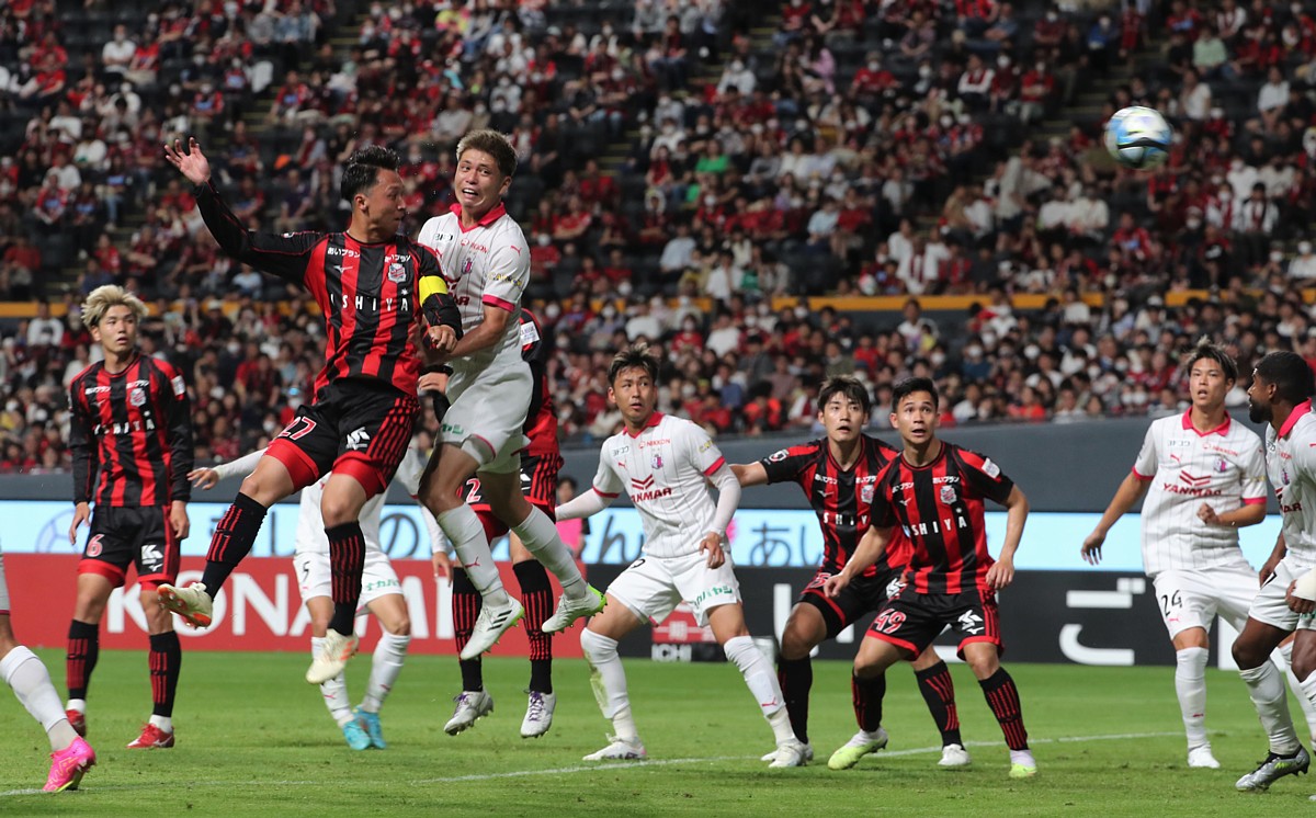 前半45分、札幌MFスパチョーク(49番)が得た右CKから荒野(27番)がC大阪DF進藤と競りながらヘディングシュートを決め一矢を報いる、左端MF中村(6番)、右にDF岡村、その前はスパチョーク。写真は6月24日、札幌ドーム、撮影・石井一弘
