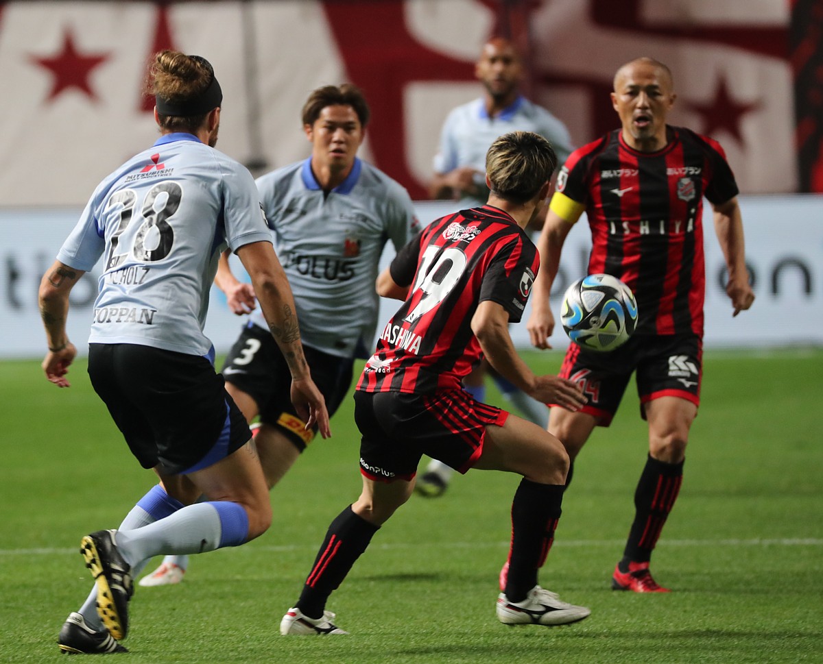 前半6分、札幌FW小柏(19番)が後方からくるMF小野(右端)にパスを出す、左端浦和DFアレクサンダー・ショルツ(28番)、その右MF伊藤(3番)。写真は12月3日、札幌ドーム、撮影・石井一弘
