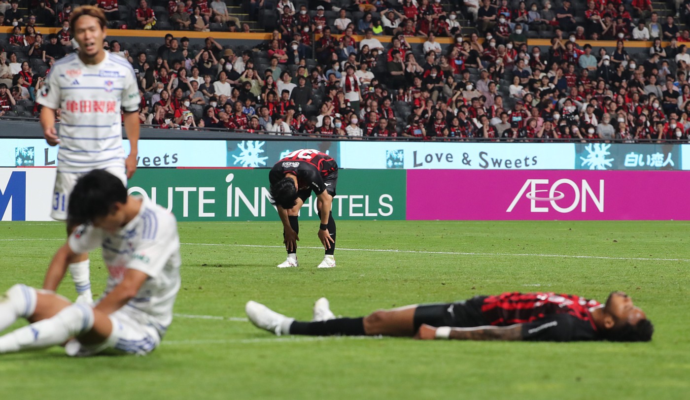 後半11分、札幌FW鈴木はシュートを外しピッチ上で仰向けに倒れる、後方でMF田中宏もガックリ、左手前新潟DF稲村、後方堀米(31番)。写真は6月29日、札幌ドーム、撮影・石井一弘