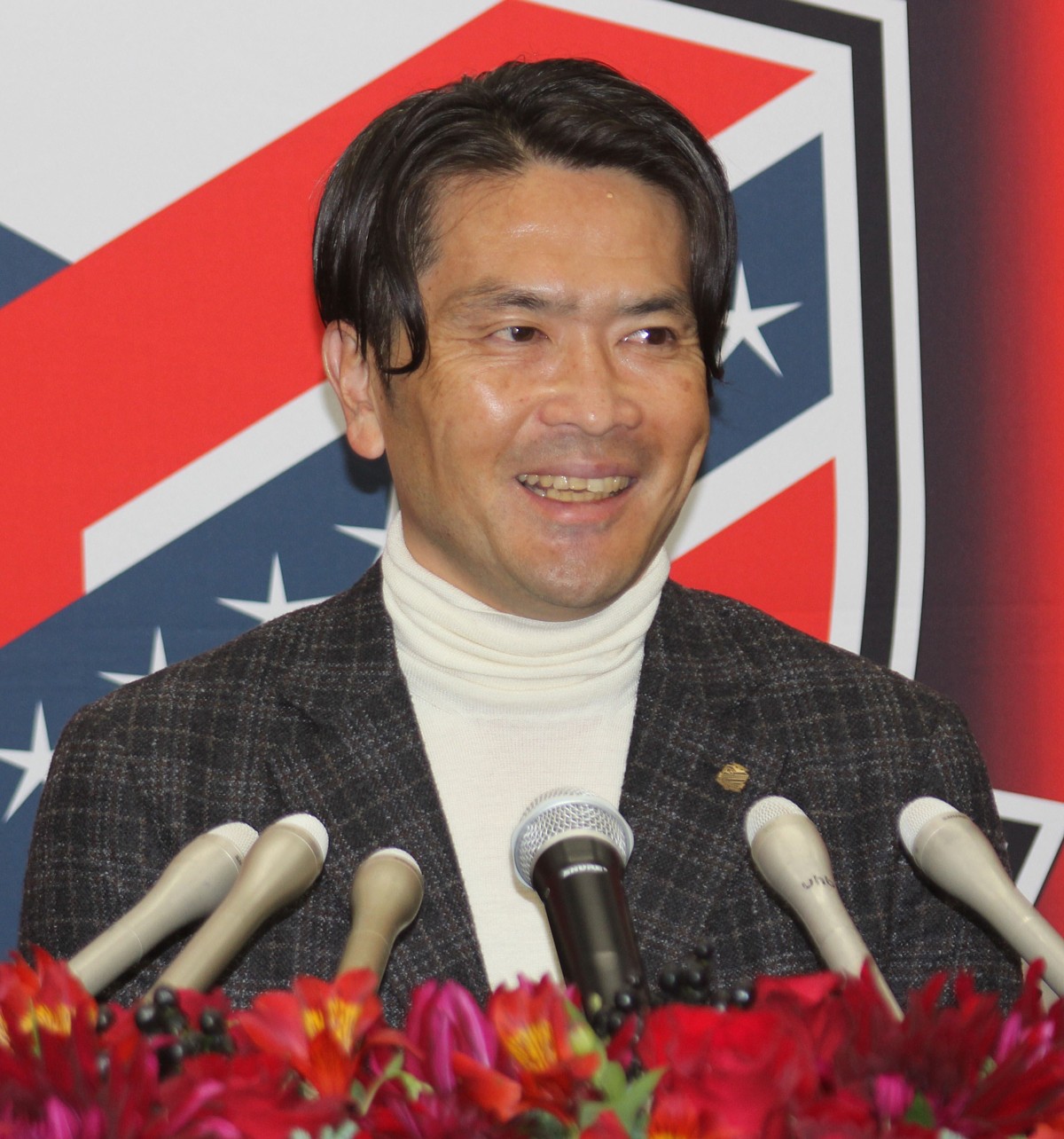 北海道コンサドーレ札幌の新監督に就任し会見する岩政大樹氏(写真は12月12日、大和ハウス プレミストドーム、撮影・石井一弘)