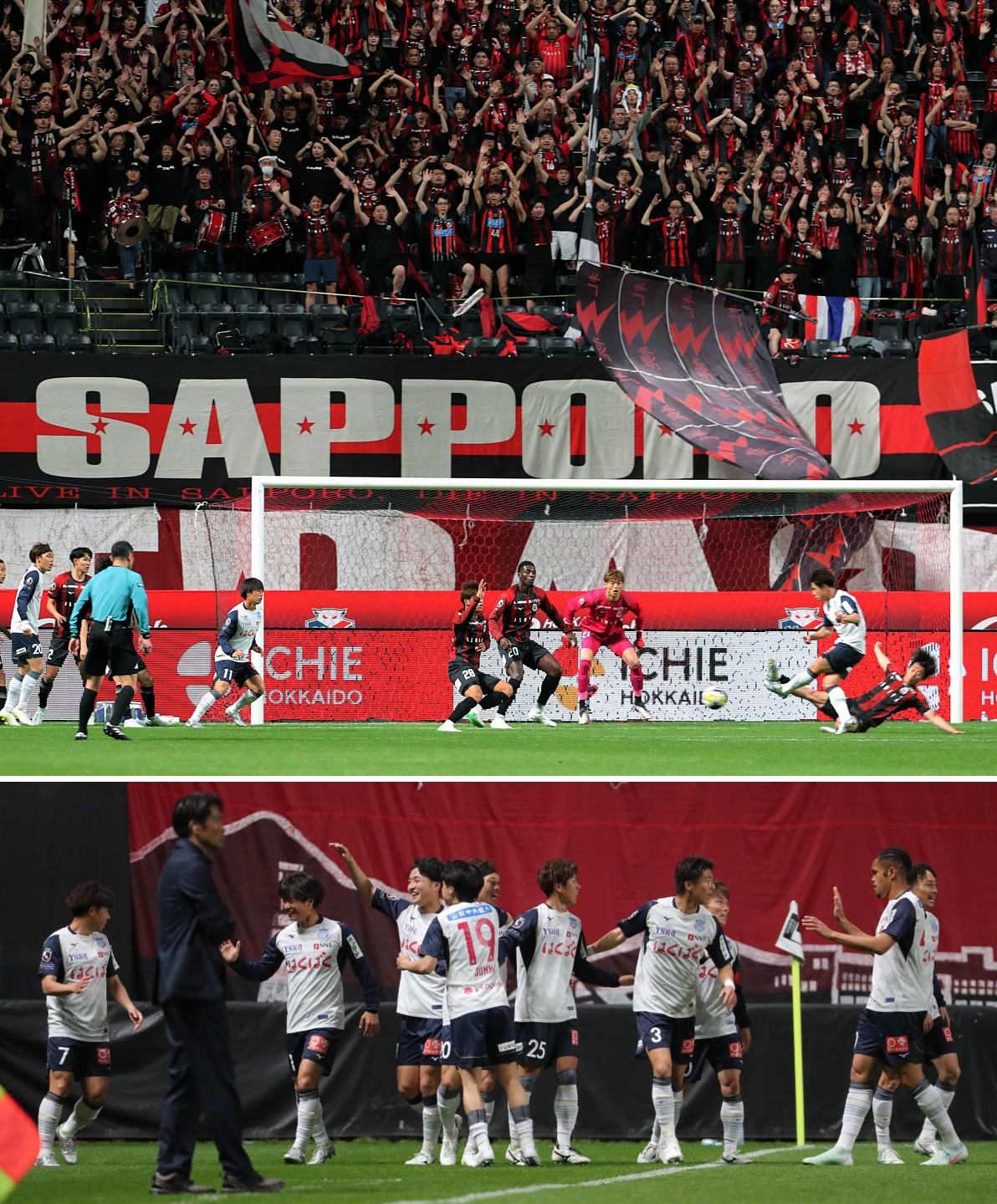 上:上段写真/前半7分、甲府左CKからMF荒木(右から2人目)が札幌FW近藤のスライディングをかわして先制ゴールを決める、GP中野の前にFWバカヨコとDF岡田がいるがそれにしてもスカスカ、後押しする札幌サポーターの前で屈辱の失点だ。 上:下段写真/前半7分、甲府MF荒木(左端7番)の先制ゴールに喜ぶ甲府の選手たちの横でぼう然とする札幌岩政監督。写真は3月29日、大和ハウス プレミストドーム、撮影・石井一弘