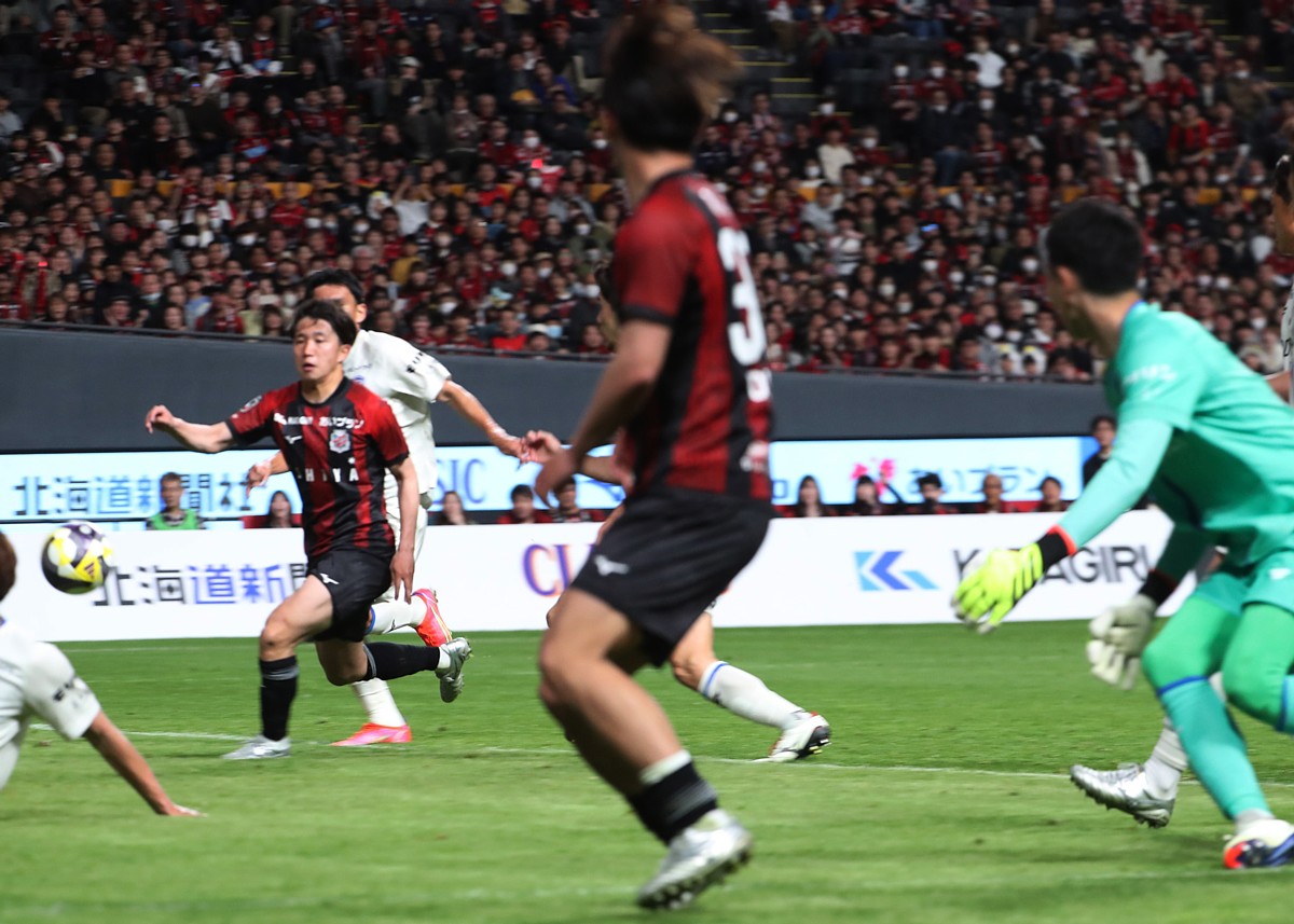 後半追加タイム3分、札幌右CKの流れで混戦となり中央から左サイドに高くこぼれたボールに、抜け出したFW近藤(中央)が長崎GK原田(右端)をかわしてクロスを入れ、走り込んだMF原(左)が同点ゴールを決める。写真は4月29日、大和ハウス プレミストドーム、撮影・石井一弘