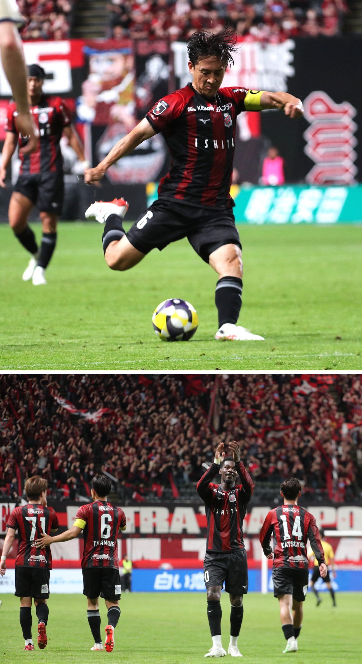上:上段写真/札幌MF木戸からのパスを受け高嶺がシュートを放つ、前線にいたFWアマドゥ・バカヨコに当たってゴール、結果的にアシストとなる。上:下段写真/同45分、先制ゴールを決めた札幌FWアマドゥ・バカヨコ(右から2人目)がスタンドの声援に応える、その左アシストしたMF高嶺(6番)、左端FW白井(71番)、右MF田中克(14番)。写真は7月5日、大和ハウス プレミストドーム、撮影・石井一弘