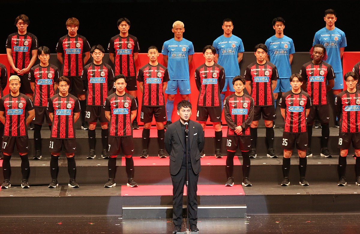 勢ぞろいした選手たちを後ろに、あいさつする川井健太監督。写真は1月9日、札幌文化芸術劇場hitaru、撮影・石井一弘