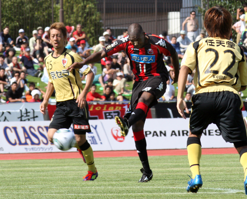 京都戦、後半2分札幌はMF内村からの折り返しパスを受けたFWジオゴ(11番)が、いったん京都の選手に当たってこぼれたボールをドリブルで持ち込み、自身来日初ゴールとなる同点ゴールを決める。8月21日、函館市千代台公園陸上競技場、撮影・石井一弘