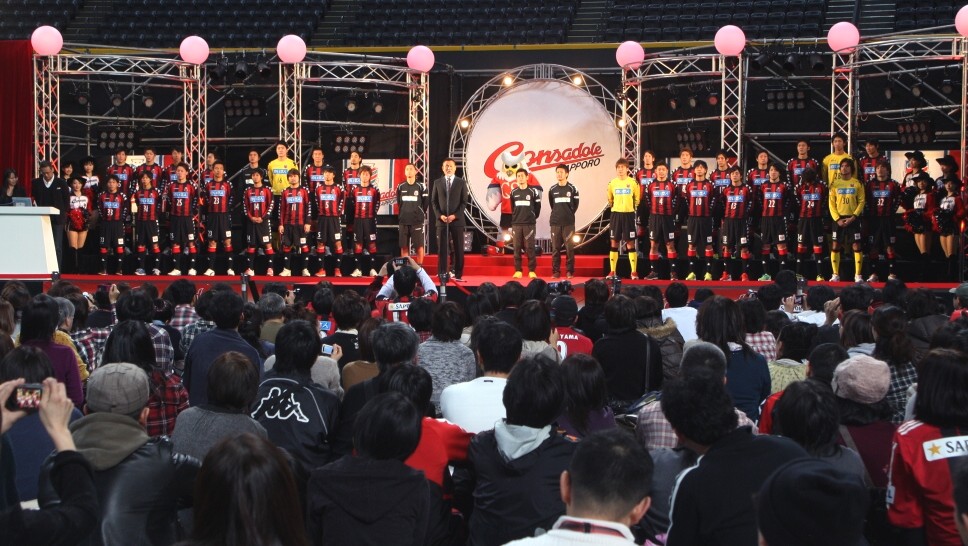「コンサドーレ札幌キックオフ2012」で新ユニホームを着て勢揃いした選手、コーチを後ろに、代表して挨拶する石崎信弘監督(中央)。1月15日、札幌ドーム、撮影・石井一弘
