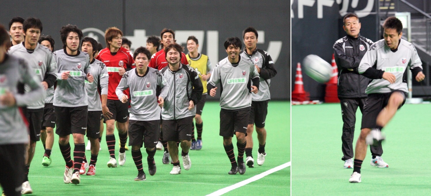 上左写真/1月18日、ランニング中も笑顔がはじける。新加入の選手たちもチームに溶け込んでいるように見える。上右写真/1月16日、石崎監督の前でボールさばきを見せる新加入のFW大島。豊富な経験とポストプレーなど監督の期待も大きい。札幌ドーム、撮影・石井一弘