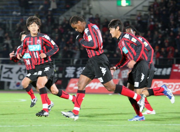 栃木SC戦前半17分、FWキリノ(中央)が先制ゴールを決め、キリノのところに集まってくるコンサドーレ札幌の選手たち、左からMF上里(20番)、FW宮澤(11番)、DF西嶋(6番)、MFダニルソン。10月21日、札幌厚別公園競技場、撮影・石井一弘