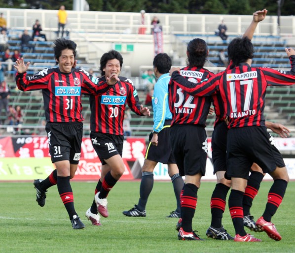 甲府戦、後半4分札幌は高校生JリーガーMF三上(31番)がうれしいJ初ゴールを決めて同点とし、初々しい表情を見せながらチームメートに駈け寄る。10月16日、札幌厚別公園競技場、撮影・石井一弘