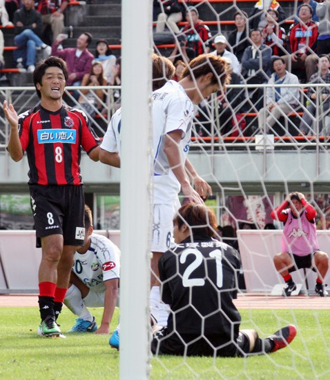 徳島戦、後半39分札幌MF砂川(8番)がドリブルで持ち込むシュートするが徳島GKオ スンフン(21番)に好セーブされ思わず無念の表情、右奥で札幌控えのDF岡山も思わず手を頭に。9月24日、札幌厚別公園競技場、撮影・石井一弘