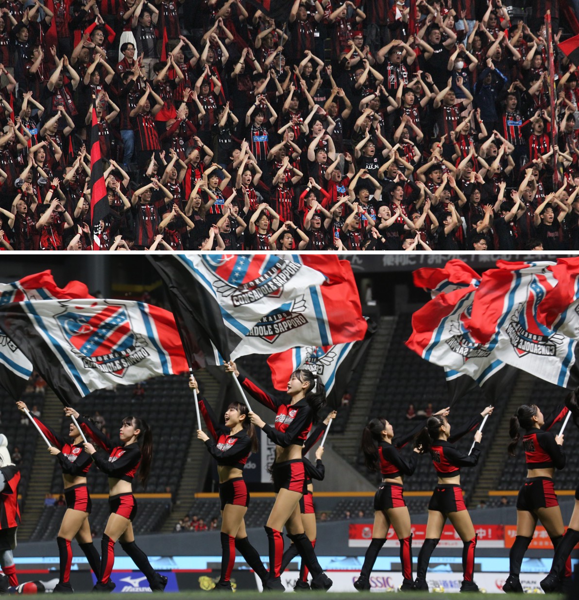 上:上段写真/J2第17節札幌対富山戦、試合開始前のゴール裏熱烈サポーターの応援は一糸乱れず。上:下段写真/勝利の女神コンサドールズの今季のパフォーマンスは旗を持っている。写真は5月17日、大和ハウス プレミストドーム、撮影・石井一弘