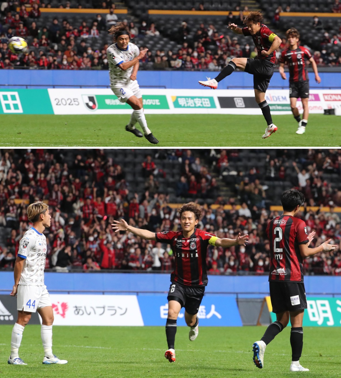 上:上段写真/後半32分、札幌MF高嶺(右から2人目)が右CKの流れから、相手DFがクリアーしたボールを走り込んで左足でシュート、自身2点目、チーム3点目を上げる、右奥近藤、左大分DF岡本(2番)。上:下段写真/同32分、札幌MF高嶺(6番)が狙い通りのゴールを決め両手を広げてベンチ方向へ走り出す、その右DF高尾(2番)が拍手、左途中出場していた大分DF吉田(44番)。写真は11月8日、大和ハウス プレミストドーム、撮影・石井一弘